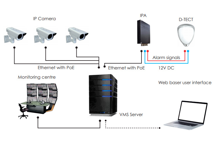 L'IPA permet aux détecteurs de mouvement, aux illuminateurs à lumière blanche ou infrarouge, aux barrières à micro-ondes, aux alarmes de clôture et aux capteurs enterrés de s'intégrer parfaitement à votre système de vidéosurveillance.