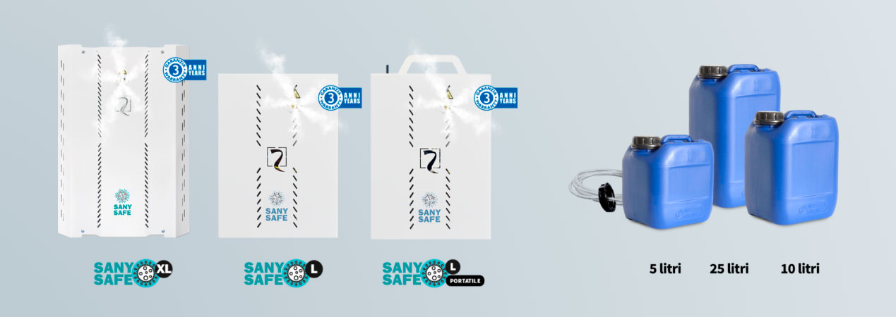 Sany Safe steams est un puissant détergent désinfectant, non toxique, adapté à tous les environnements, qui élimine les agents pathogènes tels que les virus, les germes, les bactéries et les champignons aussi bien sur les surfaces qu’en suspension dans l’air, en diffusant dans l’environnement des microparticules invisibles capables de pénétrer même dans les endroits les plus inaccessibles.
